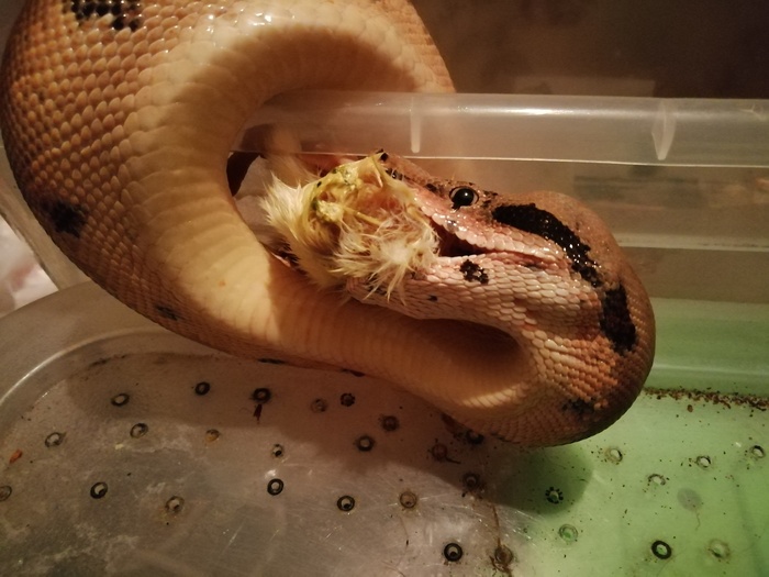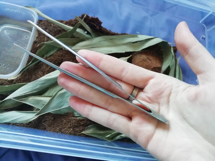 Корм. Да, вот так. Кормят скоп живыми насекомыми. Можно и разморозкой, но лучше живые сверчки и тараканы разных видов. А они ой как хорошо сбегают :) А сверчки и поют. Мне вот нравится, а многих раздражает. А ещё я как-то случайно плохо закрыла садок со сверчками и случайно опрокинула его. 140+ сверчков. Собирать/ловить - отдельное удовольствие :)