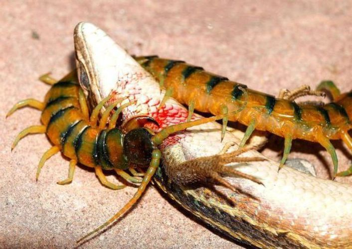 Гигантская сколопендра — крупное хищное членистоногое животное. Это тот редкий пример, когда вроде бы достаточно примитивная форма жизни успешно охотиться на млекопитающих, птиц, рептилий и амфибий. Основу рациона этой штуки составляют насекомые, лягушки, ящерицы, грызуны и, неожиданно, летучие мыши. Чтобы поймать летучую мышку, сколопендра карабкается к потолку пещеры, в которой летуны спят днем, и яростно хватает беззащитного вампира, вводя в организм летальную дозу жидких пиздюлей. К счастью, одной убитой мыши сколопендре хватит чуть ли не на месяц.