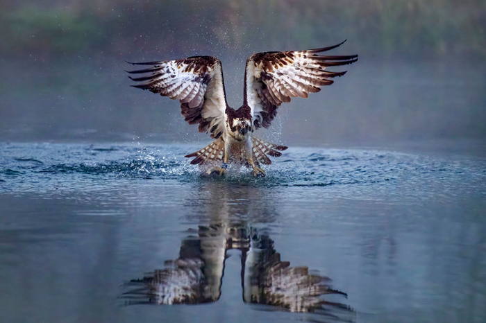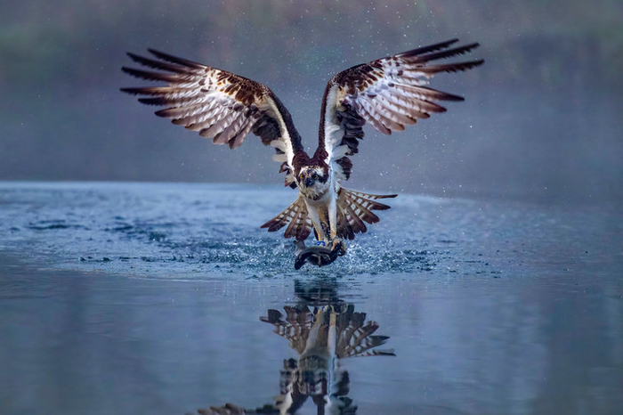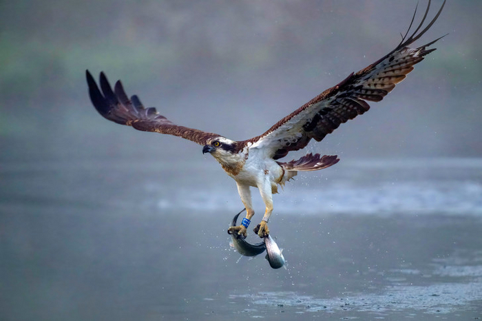 Великобритания, графство Ратленд. Фотографу удалось запечатлеть исключительно удачную охоту скопы (Pandion haliaetus) — птице удалось выловить из воды сразу двух рыб.