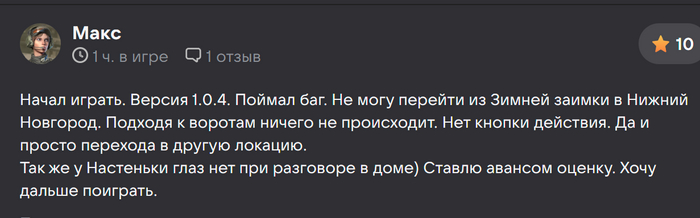 Есть конечно положительные отзывы на "смуту" с 25+ часов в игре, но таких о-о-очень мало. То есть люди, которые в восторге от игры, по каким то причинам забросили её в самом начале. За месяц можно было бы и наиграть в неё 20 часов чтобы пройти до конца.