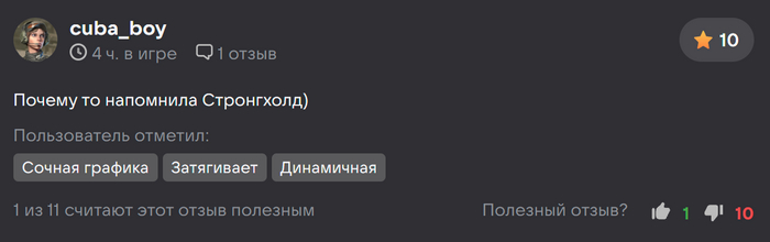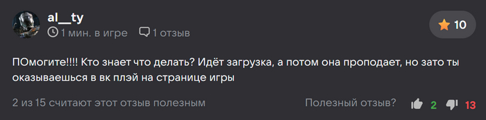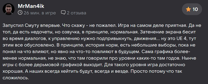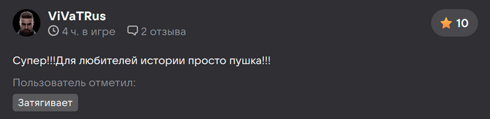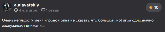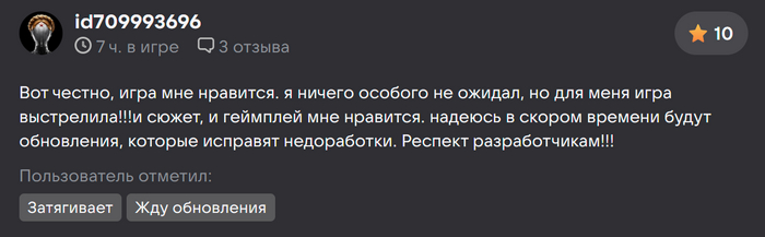 Далее вставлю несколько отзывов с максимальной оценкой в VK Play. Обратите внимание на наигранное время. Я подумал, что система фиксирует наигранное время на момент написания отзыва и пошел посмотреть на отзывы Atomic Heart. И большинство отзывов в Атомике с 40+ часов, есть даже 150+ часов.