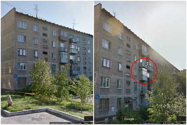 Пострадавшая хрущевка в наши дни и балкон квартиры, куда целился пилот