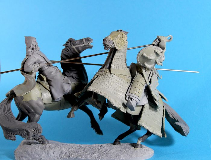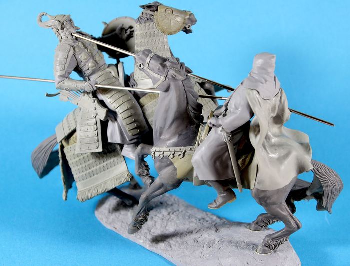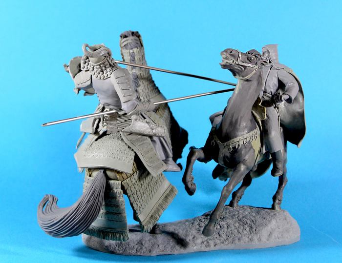 Есть такая версия, что Пересвет выехал на поединок с Челубеем без доспехов. Мотивируется это тем, что был он опытным воином и осознавал, что дотянуться до супостата просто не сможет, если тот уткнётся своим копьём в его броню и сила встречного удара просто выбьет нашего героя из седла, поскольку Челубей был действительно велик ростом и оружие ему было под стать. А вот нанизавшись на монгольское копьё можно было достать противника. Так, видимо и произошло. Ибо монголо-татарин упал замертво, а Пересвет вернулся к своим с копьём в теле и умер. Собственно, как бы там ни было - подвиг остаётся подвигом. Высота фигурок на виньетке 120 мм. Всё разборное под литьё из металла. Фотографий в росписи пока найти не смог, если найду - выложу отдельно. Благодарю вас внимание и время уделённое просмотру. Копьё, прошедшее насквозь я делать не стал, ибо возможно детское внимание. Поводьев нет, потому, что их технологически правильно делать уже во время росписи. Стремена на самом деле есть, но они отсутствуют на фото по причине того, что их нет смысла закреплять на клей, а потом отдирать.