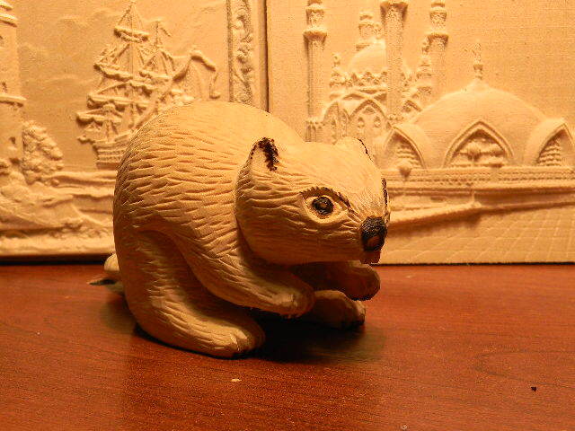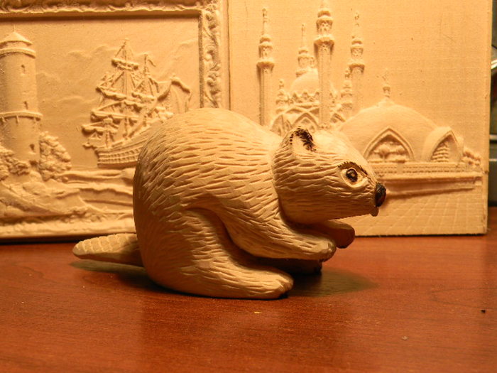 Бобер из липы сделан, размерами 50*40*70 миллиметров. Тонирован местами черной мастикой. Всем бобрам привет).