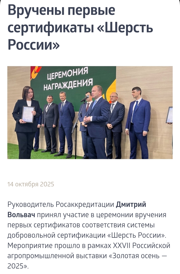 Ребята, оказывается у нас в стране есть система добровольной сертификации "Шерсть России" и 14 октября первые сертификаты соответствия были вручены участникам данной системы.