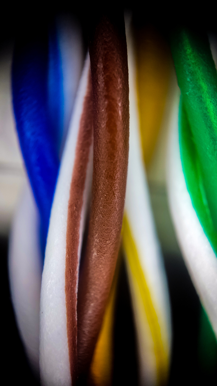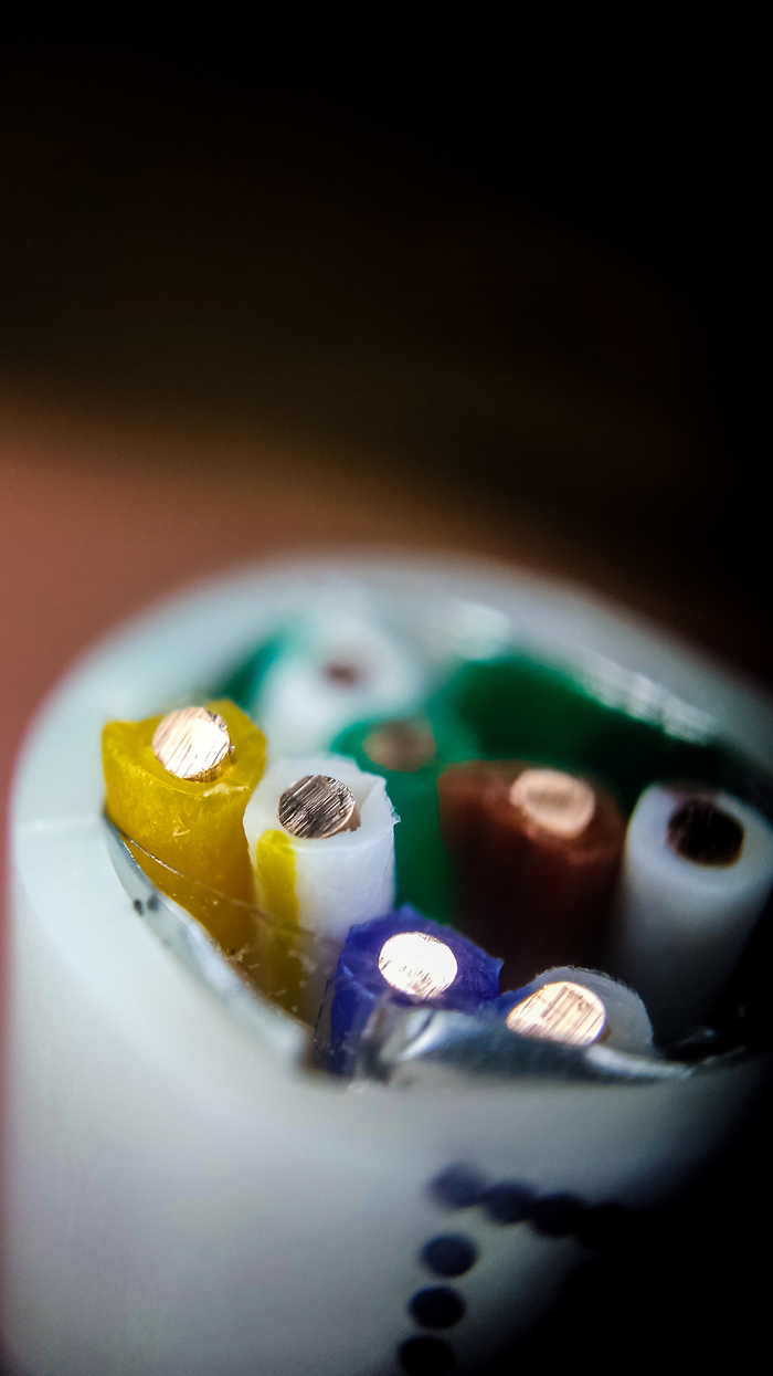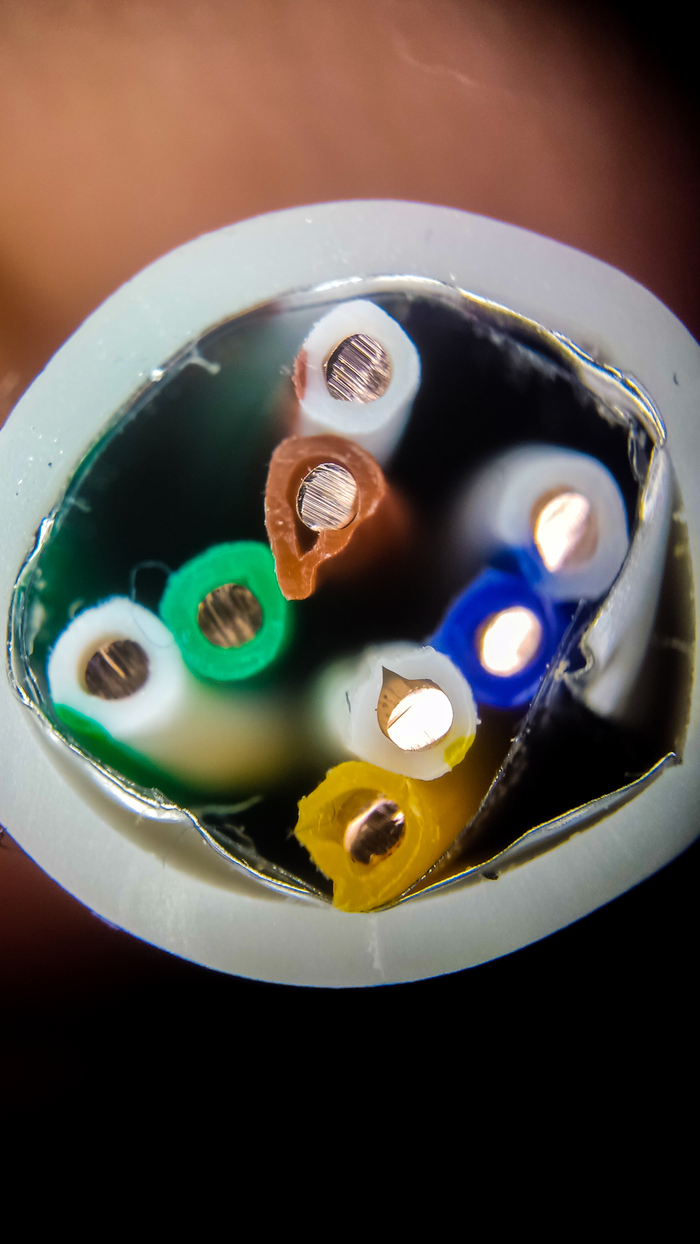 Кабель на который смотрим сегодня не такой важный для человека как те, по которым передается электричество, но все сети, том числе и любимый наш интернет держатся на нем. Это FTP кабель на 8 жил 1000 мб/сек. Вообще есть UTP, а есть FTP и разница в них в наличии у FTP экранирования. Слой фольги защищает от помех. Жила у кабеля тоже медная, но значительно тоньше чем у бытового силового.