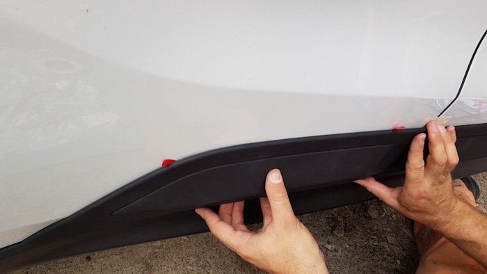 Вернемся к толщине 0,8мм, которая доминирует в автомагазинах. Когда на нее крепят ветровики, частой проблемой является несовпадение форм склеиваемых материалов. Вот у нас есть дверь, а вот молдинг. И вроде форма одинаковая, но есть небольшая разница. По идее, проблему перекосов и несовпадений должен решить скотч, вернее его основа, которая в одних местах прижмется, в других подрастянется и вуаля. Однако проблема в том, что у качественной основы скотча есть предел, до которого она способна компенсировать растяжение и сжатие. У тех же 3М или Тезы толщина в 4 раза от начальной.