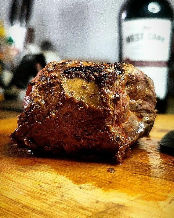 Берём кусок сёмги и маринуем его минут 5-10 в смеси соевого соуса, трёх капель бальзамического уксуса (не знаю зачем, но раз под руку подвернулся, то надо), розмарина, щепотки мяты сухой и сладкого красного перца. Затем жарим до готовности, т.е. минуты по 2-3 с каждой стороны на среднем огне.