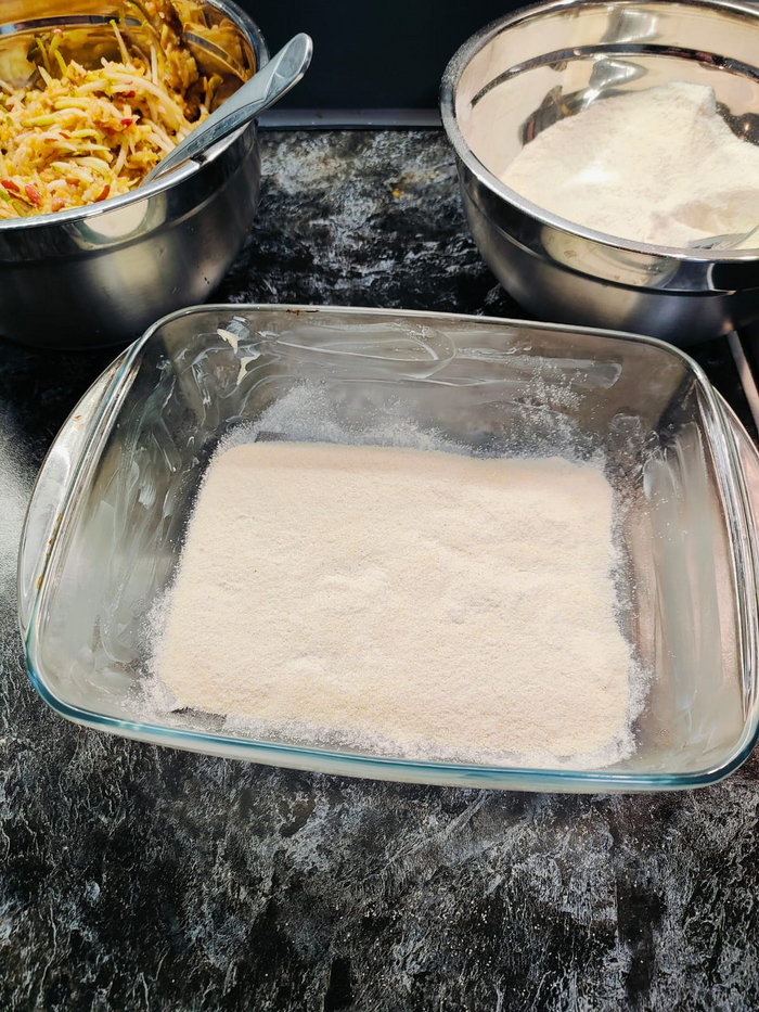 И так до последнего слоя которым будет сухая смесь. Выливаю сверху растопленное сливочное масло. Если масло замороженное можно натереть на терке. Главное ровно его распределить.