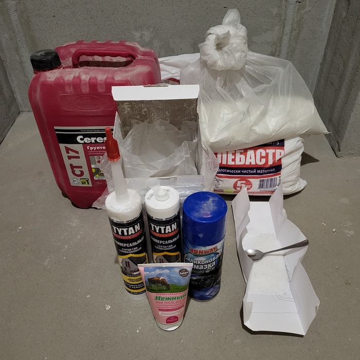 Итак, у меня было 2 тюбика силиконового герметика, 75 грамм поваренной соли, 5 килограмм чистейшего цемента, пол тюбика крема и гора шпателей и всего такого всех цветов, а ещё килограмм талька, баллон силиконовой смазки, канистра грунтовки, пол литра моющего средства и дюжина килограмм алебастра. Не то, чтобы всё это было нужно для слепка, но раз уж начал творить хуйню, то иди в своём увлечение до конца.