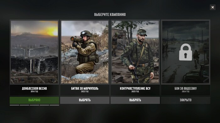 Бесплатно доступна первая кампания «Донбасская Весна», три остальные платные, одна из них пока в разработке. Вообще, игра пока в бета-тестировании, по сути, в раннем доступе. Версия 0.2.02.
