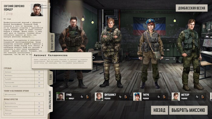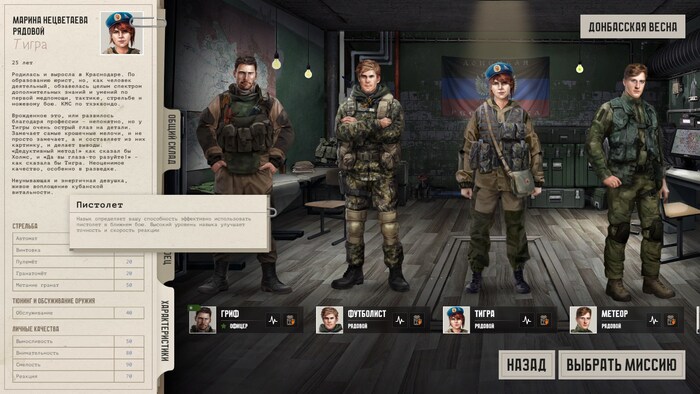 Далее смотрим свой отряд. У каждого бойца множество важных статов. Их описания можно почитать в удобных контекстных меню. Тут и ловкость в обращении с разными видами оружия и параметры, позволяющие условно прогнозировать поведение бойца в разных стрессовых ситуациях.