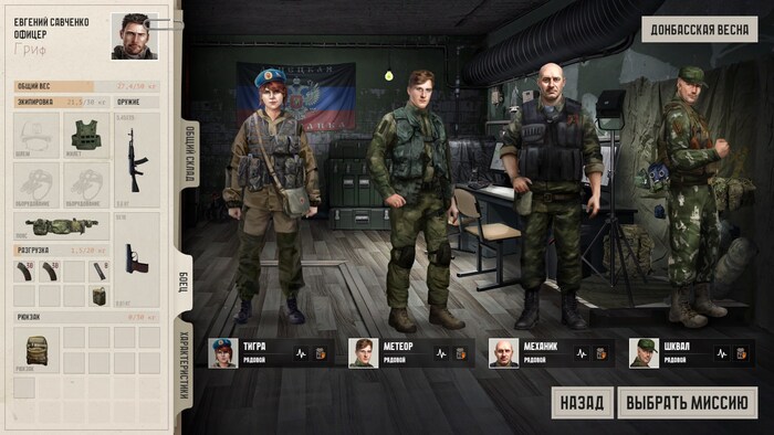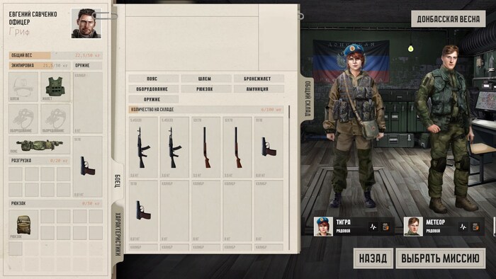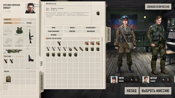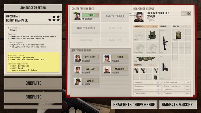 Кроме того, отряд надо экипировать снаряжением. Для первой миссии доступно несколько Калашей, ружей, пистолетов и патронов к ним. Имеются аптечки и даже одна граната.