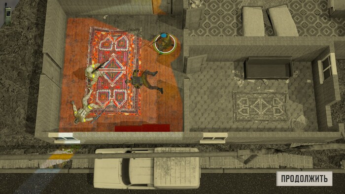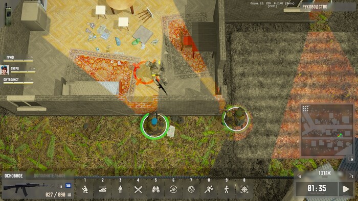 Первое моё неудачное знакомство с противниками началось с того, что мои воины, строго по науке, подползли по-пластунски под окно. Однако, это не помешало врагу увидеть их, хотя он не мог это физически сделать и кидануть две гранаты. (Одна отскочила от стены обратно, я думал ему конец, поэтому дождался следующей.) Итого — труп ключевого героя, начинаем с начала.