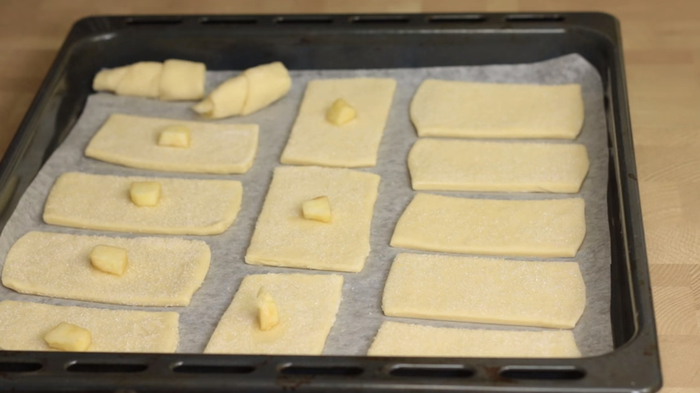 4.Займемся тестом.Разморозим слоеное тесто и раскатаем его в тонкий пласт.Нарезаем тесто на полосочки шириной около 4 см и длиной около 25 см.Каждую полосочку смазываем джемом и сверху выкладываем подготовленные яблоки в небольшой нахлест,а также присыпаем смесью корицы с ванильным сахаром.Делаем небольшой загиб из теста на яблоки и сворачиваем рулетом каждую полосочку.
