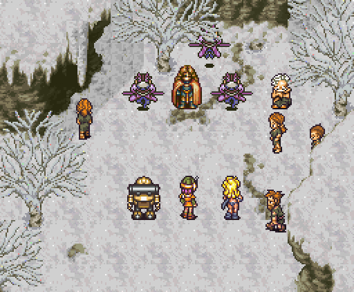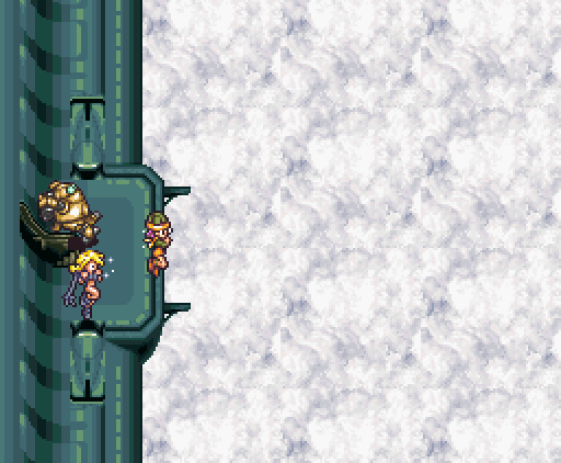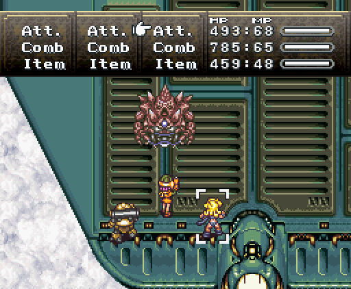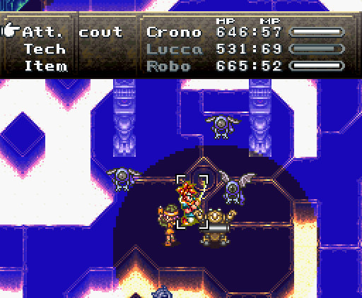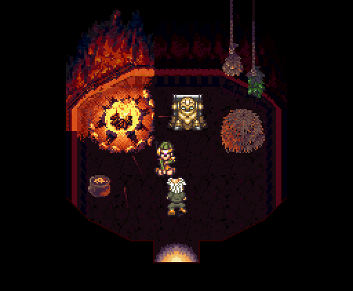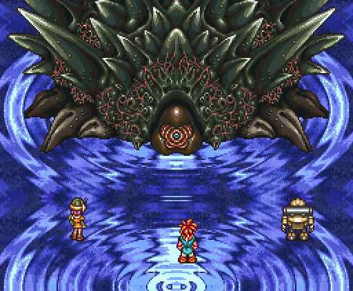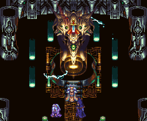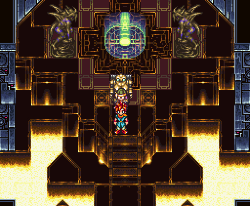 Робо исцеляет Хроно и Лукку, и они втроём бегут в главный зал, где в торжественном полумраке висит Устройство Демонического Бога.