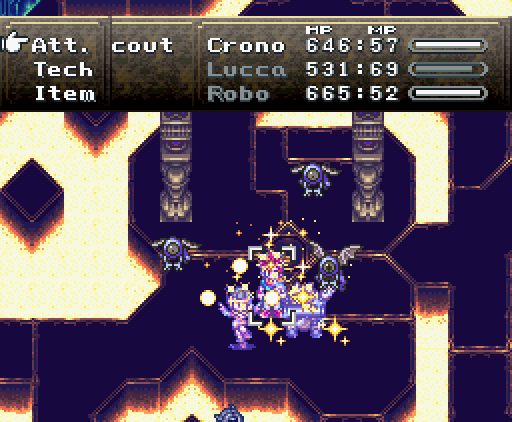 Робо и Лукка осваивают свои самые сильные техники, поражающие всех противников вокруг. У Робо это *электрическая атака*, а у Лукки - заклинание *Вспышка*, которое наносит огромный урон.