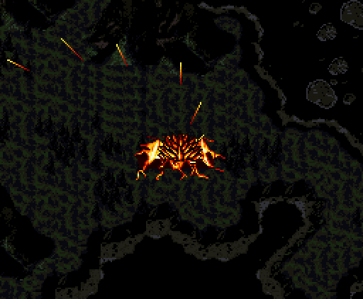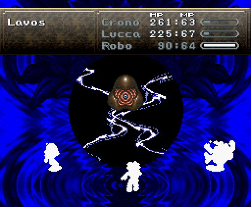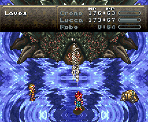 Друзья с ужасом видят, как этот клюв раскрывается, исторгая тот самый чудовищный рык. Затем Лавос... извергается. Никто даже не успевает понять, как это случилось - на героев падает огненный дождь, испепеляющий всё. Хроно и Лукка, получив сильнейшие ожоги, выживают благодаря своему защитному снаряжению, но видят, что Робо лежит неподвижно. Они пытаются бороться - Лукка стреляет по страшному клюву, но Лавос ещё больше искривляет пространство, формируя вокруг себя зону абсолютного хаоса. Хроно начинает безумно смеяться, а сверху на него уже падают острые иглы, которые Лавос выстрелил откуда-то из своей спины... Лукке удаётся продержаться немногим дольше.
