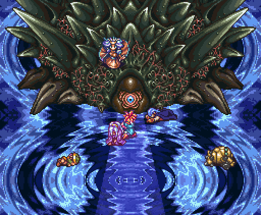 Друзья, тем временем, добираются до лифта и быстро спускаются вниз. Защитники Подводного храма наседают очень плотно, и когда становится совсем тяжко, Лукка достаёт *Мегатонную бомбу*, которую заранее приготовила. Причём, если применить её в сочетании с *Круговой бомбой* Робо - получится *Двойная бомба*!