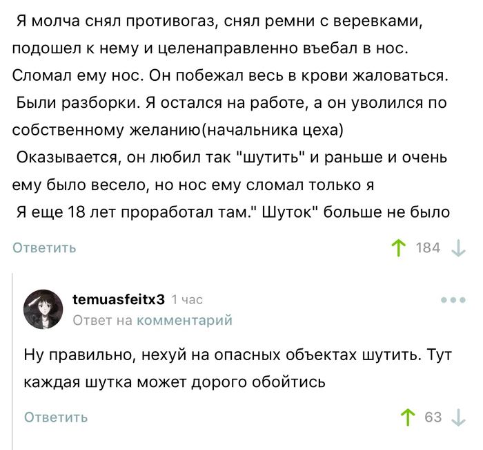 Привезли как-то шахтера с просто в мясо разбитым носом. Он, чтобы не ждать очередь на подъем к поверхности, лег на ленту, которая подает уголь наверх и поехал. Это, как оказалось, распространённая практика у шахтеров. И в какой-то момент, задумавшись, ударился головой об распорку и его начало кидать по ленте ударяя об уголь. Слетев с ленты, он разорвал противогаз и используя его содержимое как антисептик, приложил к кровоточащему лицу. Работники, увидев каску одиноко лежавшую на ленте, пошли вдоль конвейера и нашли его.