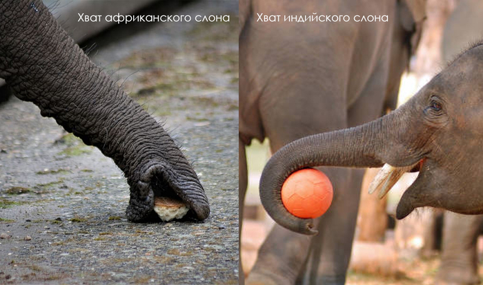 Благодаря двум «пальцам» на хоботе африканские слоны могут ловко поднимать мелкие предметы, а индийские чаще просто захватывают вещи всей поверхностью хобота.