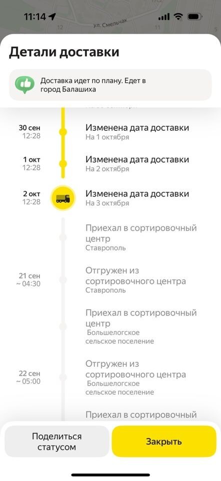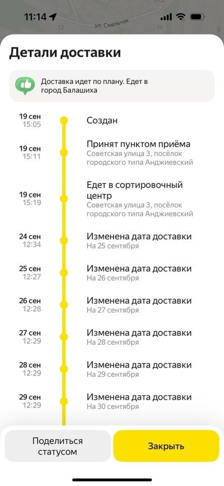 Покупатель прислал скрины отслеживания заказа в Яндексе, на которых мы видим, что посылка выехала из пункта выдачи, где я её отправила и даже не доехала до следующего сортировочного центра.