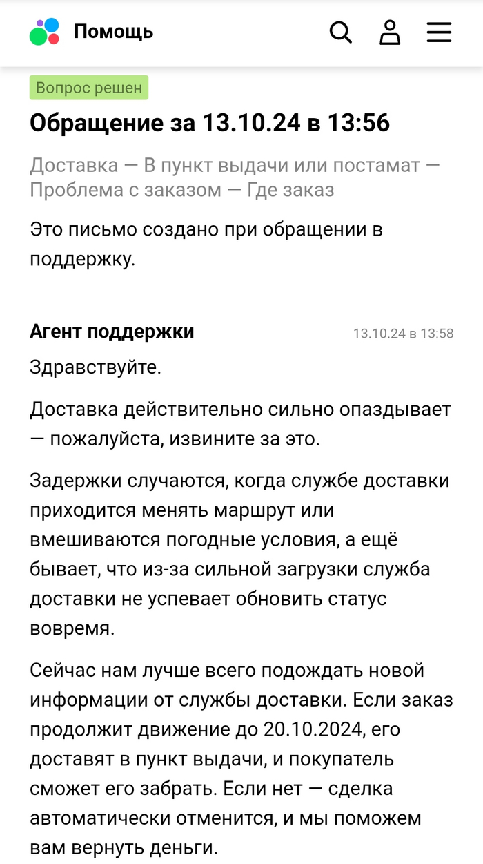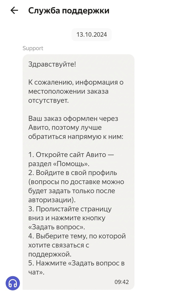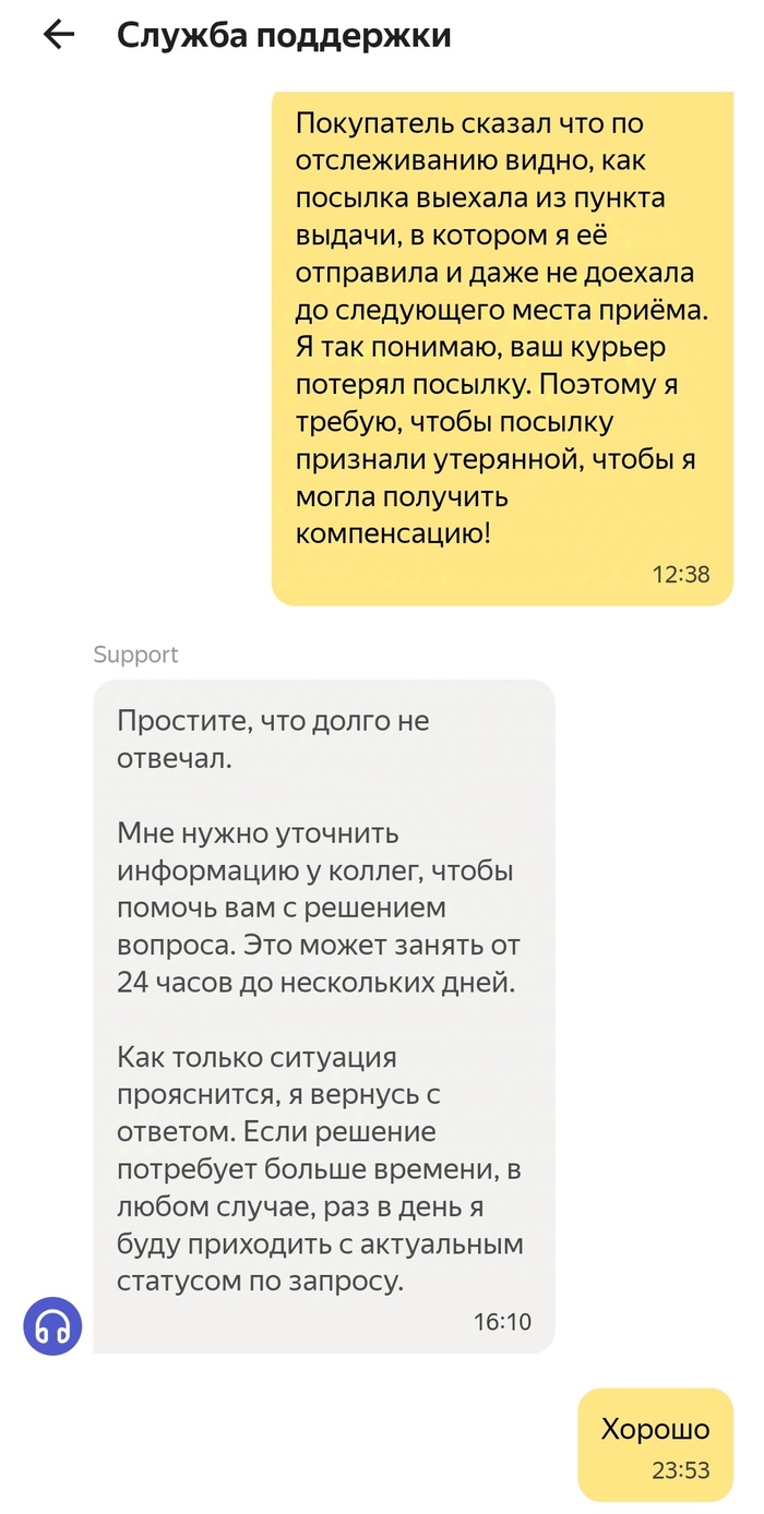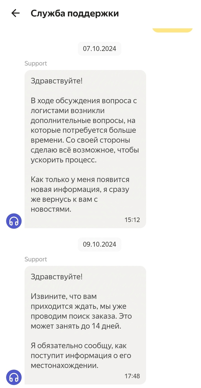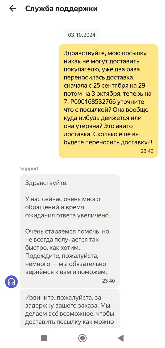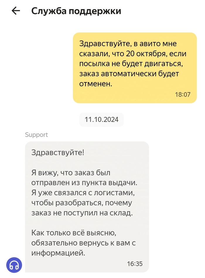 3 октября я пишу в поддержку Яндекса, где сначала проявляют участие и обещают разобраться в ситуации и отчитываться каждый день, а после не найтя мою посылку вместо того чтобы признать заказ утерянным, просто посылают меня разбираться в авито.