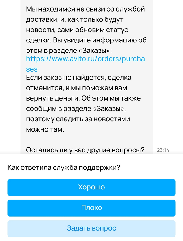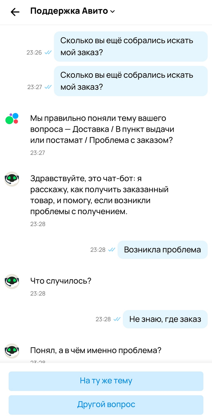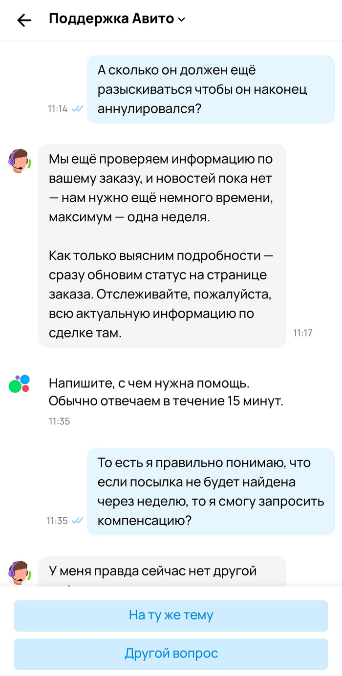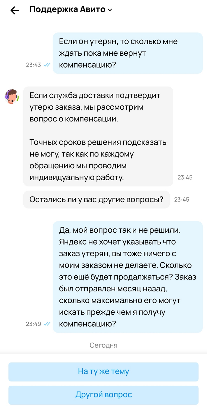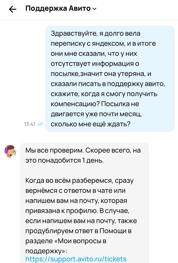 Авито и Яндекс пытаются ответственность за утерю перекинуть друг на друга и никто не хочет решать мою проблему, ведь если нет утери, значит и не надо платить компенсацию. Я постоянно пользуюсь сервисом авито, для чего тогда мы платим 7% комиссию за каждый заказ, если при этом никакой безопасной сделки нет?! Поддержка не даёт никакой конкретики, отвечают шаблонами и после их шаблонных ответов при попытке продолжить диалог бот предлагает начать диалог заново.