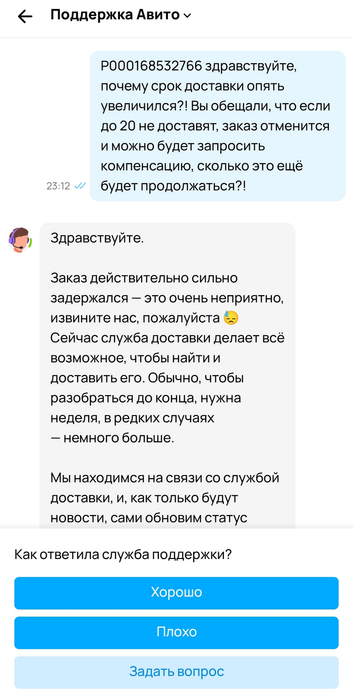 Уважаемое авито @Avito.help разберитесь пожалуйста с моим заказом. Я ждала целый месяц, когда наступит обещанное вами анулирование заказа. Признайте, что заказ был утерян и выплатите мне, пожалуйста, компенсацию.