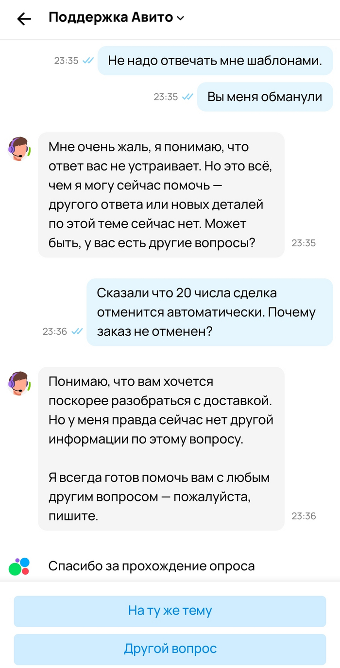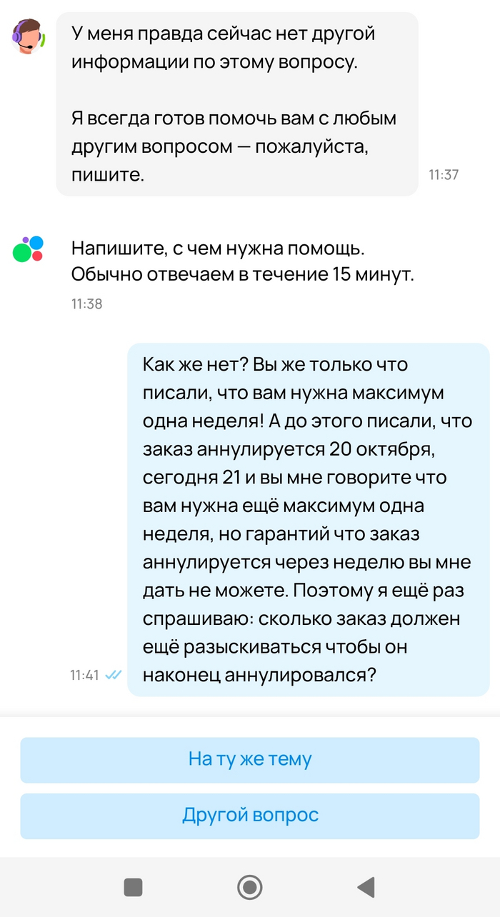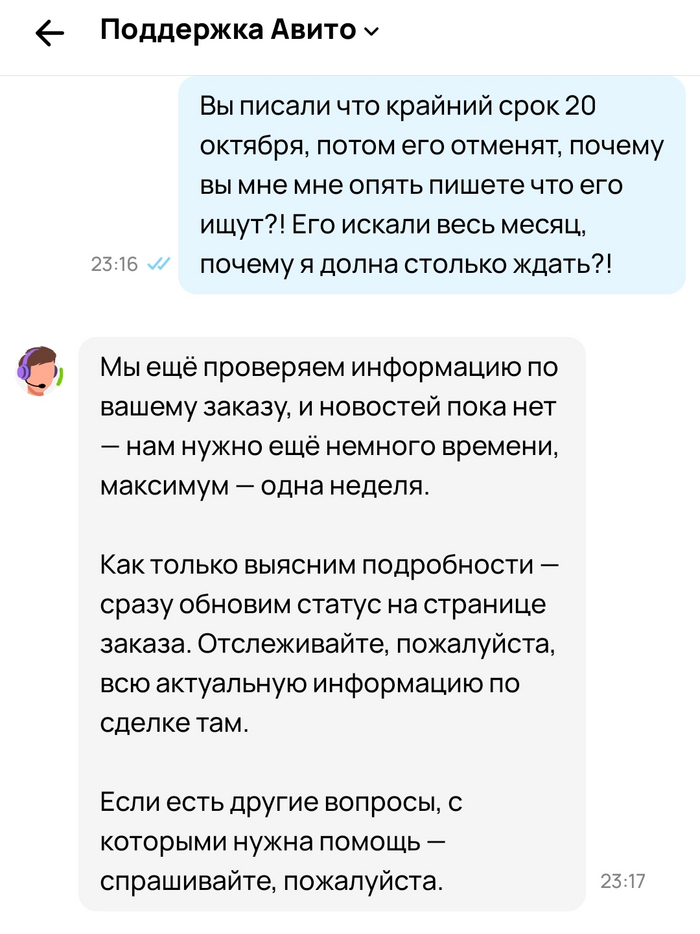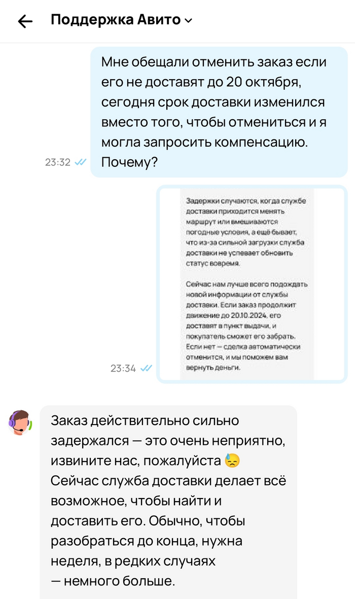 Я решаю пода ждать до 20 октября, наивно веря, что 21 можно будет подать запрос на компенсацию, но как видно из самого первого скрина доставку вновь перенесли до 24 октября включительно. Я в недоумении пишу в поддержку Авито. Мне отвечают, что им нужна неделя, чтобы разобраться в моем вопросе, хотя до этого неоднократно писали, что 20 октября заказ аннулируется. Я начинаю задавать вопросы "сколько это будет продолжаться?", на что мне отвечают исключительно шаблонами, а когда я продолжаю задавать неудобные вопросы, специалисты просто выходят из чата и меня перекидывает на бот. Там где вопросы остались без ответа, менеджер просто закрыл наш диалог.
