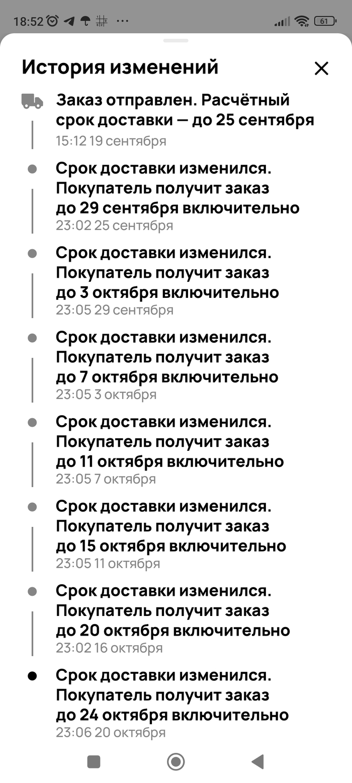 Я написала в поддержку авито 29 сентября, чтобы выяснить что с посылкой, на что мне был дан ответ, что если посылка не будет двигаться до 20 октября, заказ автоматически отменится.