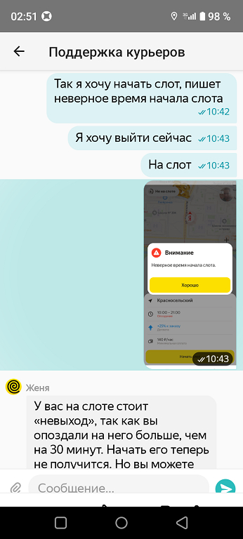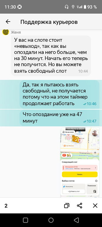Мне отвечают, что у меня на этом слоте стоит "невыход", так как я опоздал на него на полчаса, и снимают его.