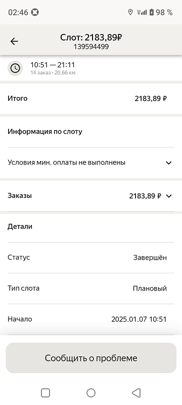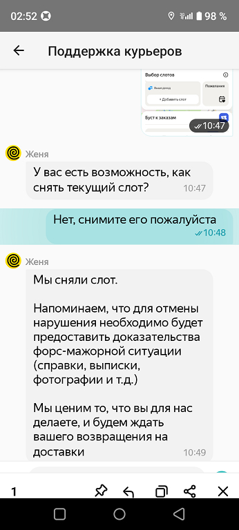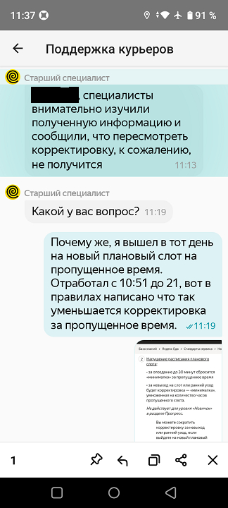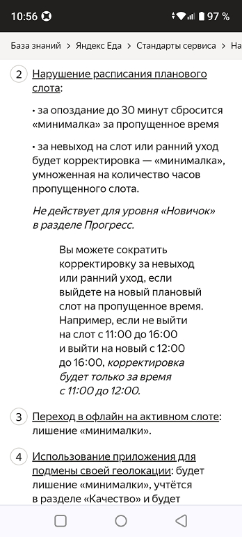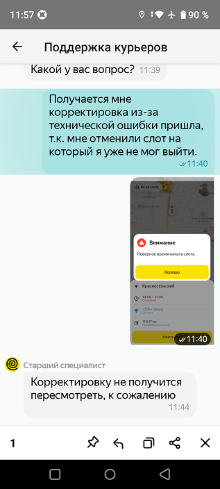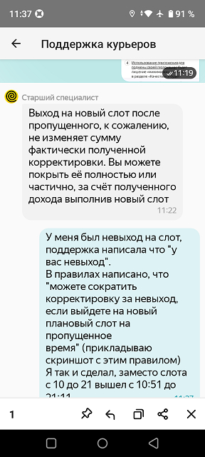 То есть, мне зачислили штраф за отмену слота на 11 часов и невыход на него, несмотря на то что я сразу же взял новый слот до 21 часа и отработал, что должно сократить корректировку (по правилам Яндекса).