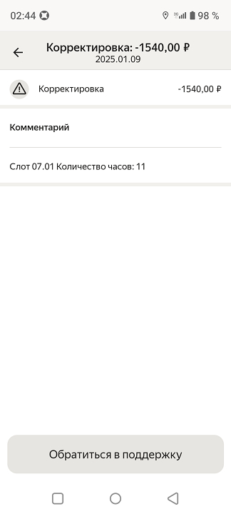 Через день прилетает корректировка от Яндекса, на 11 часов. "Минималка" в час 140 рублей, итого 11х140 = 1540 рублей в вычет :