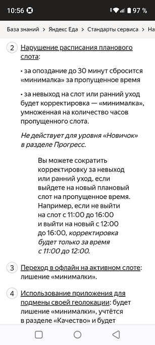 Я сразу беру новый плановый слот, с 11 часов до 21, начинаю его в 10:51, т.к. по правилам Яндекса можно сократить корректировку за невыход если выйти на новый плановый слот на пропущенное время: