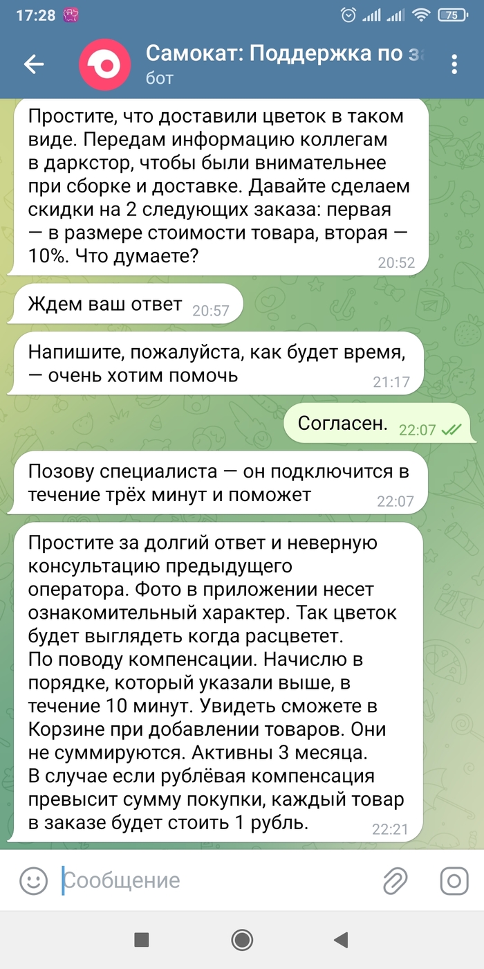 На этой неделе решила заказать в Перекрестке через сервис Яндекс.Еда, тоже большая корзина на 7к. Заказ оформила в 15.30 с доставкой до 17.55. Видно было, что заказ собирают т.к менялись весовые продукты, но как и ожидалось в 6 никто не приехал. Опущу все подробности общения с поддержкой, покажу картинкой