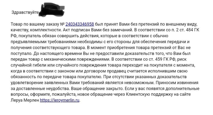 Сразу не долго думая с подсказки Гугл отправились в ближайший Леруа Мерлен, все качественно и грамотно заставили заполнить и обменяли товар на новый без лишних слов . Вроде бы , что может быть лучше . И этого поста бы не было , если бы сегодня не пришло еще сообщение от Леруа с прикрепленными файлами .