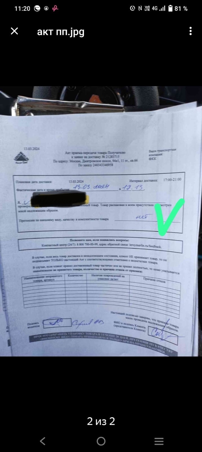 Курьер приехал , При нем вскрыта была коробка , товар был расколот на что курьер , все вопросы к Леруа , ни каких бумаг не предоставил , подписывать не нужно нечего