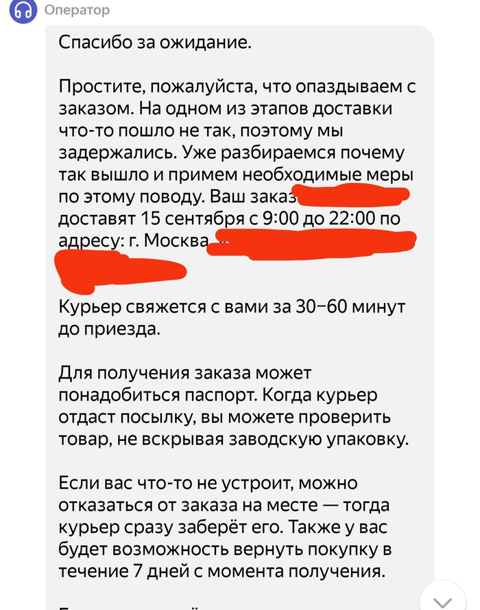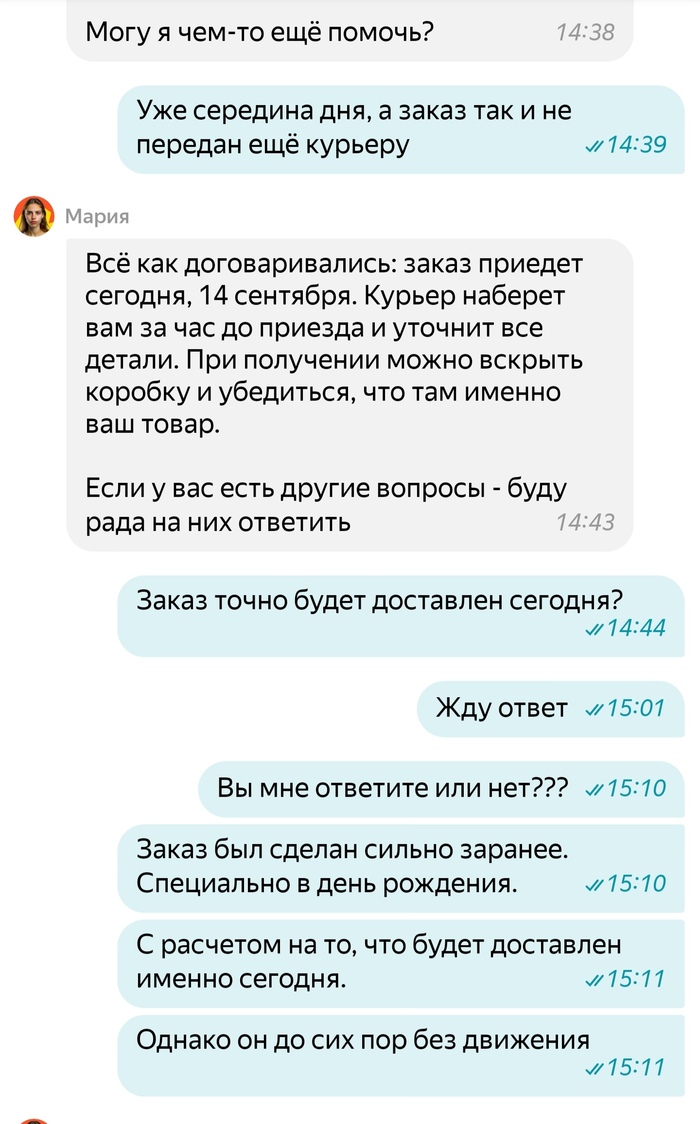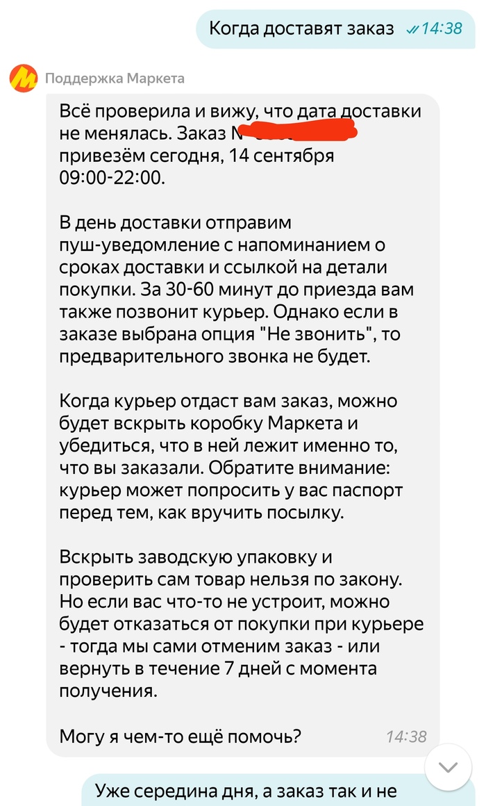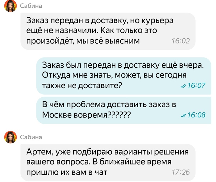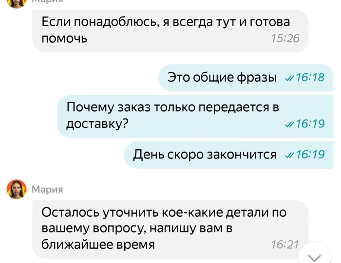 В середине дня доставки обращаю внимание, что заказ подозрительно не передается курьеру. Задаю вопрос поддержке