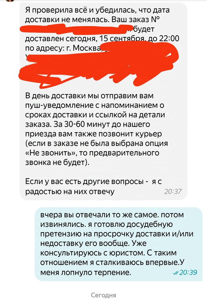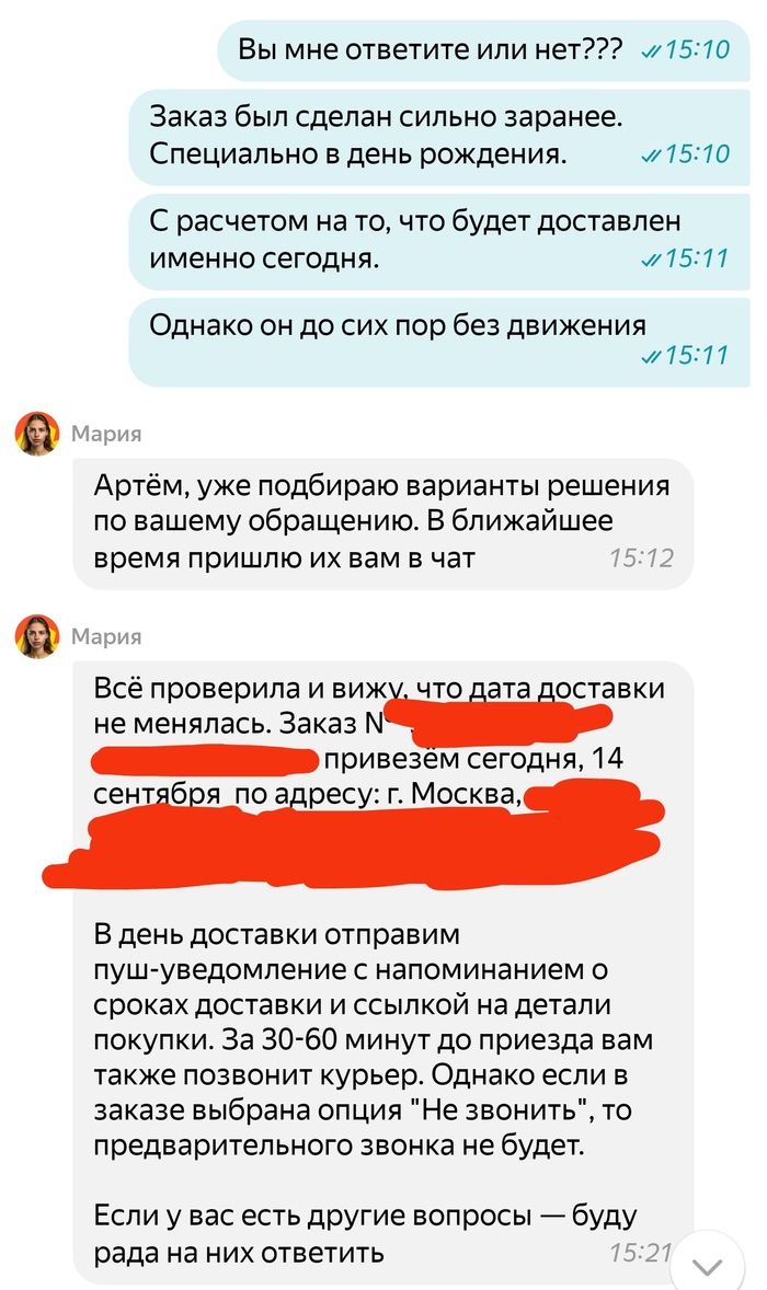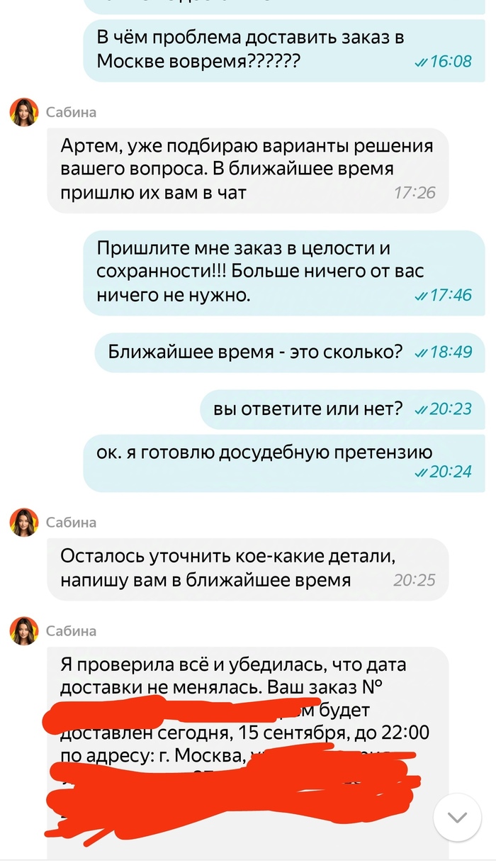 И, второе ли совпадение, сразу после второго сообщения о досудебной претензии, мне адресат подарка сообщает, что курьер будет у нее в течение 15 минут. В приложении, кстати, отслеживания так и не было.