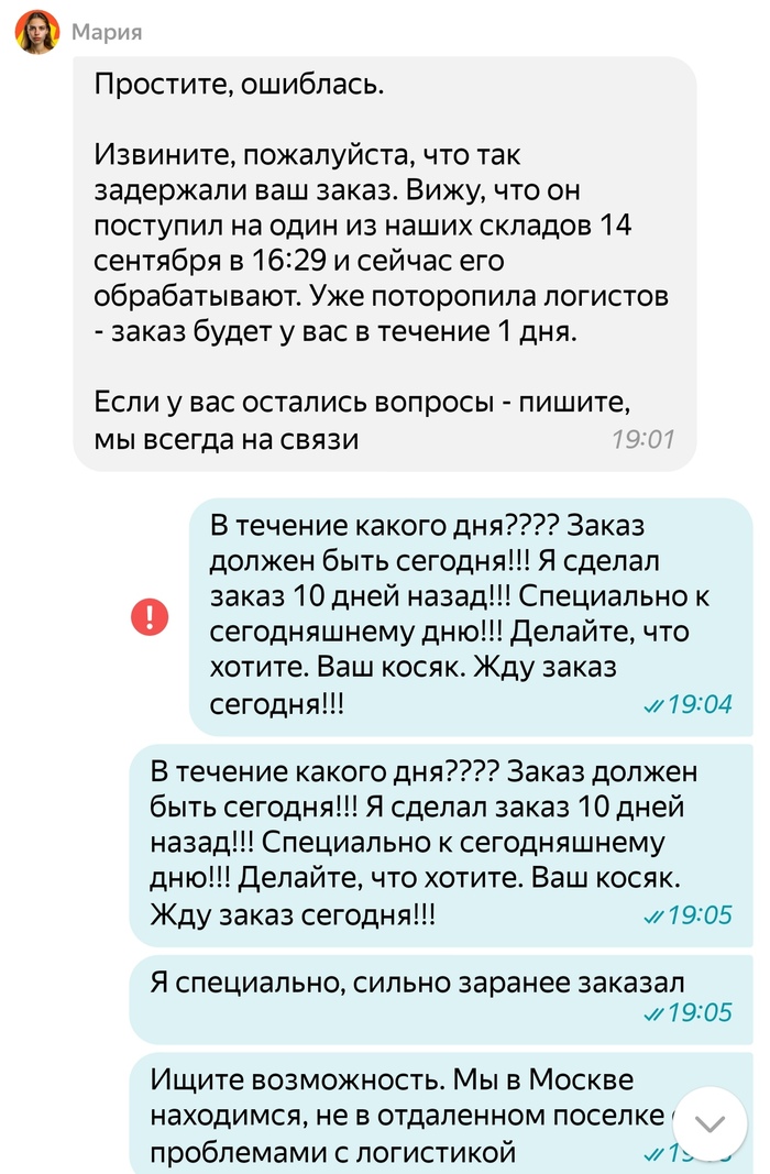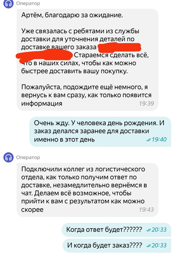 Время идёт, общие ответы от поддержки приходят всё с большей задержкой, но заказ остаётся без движения. В какой-то момент поддержка перестает отвечать.