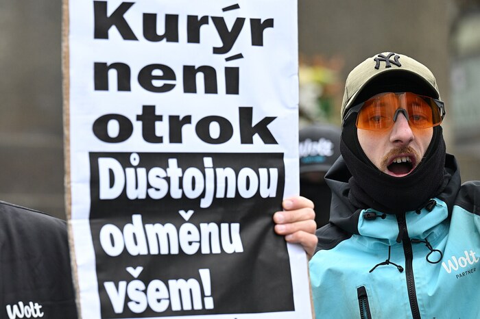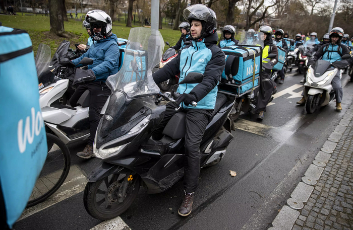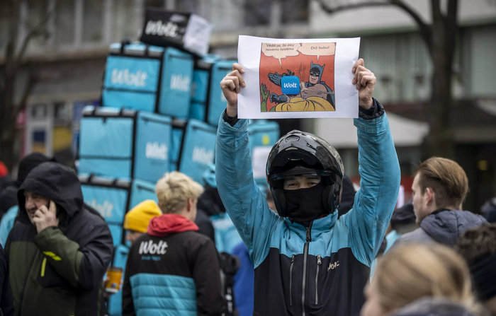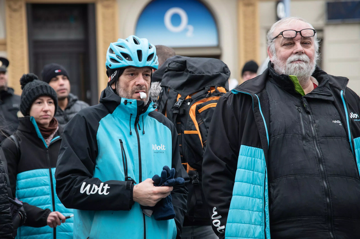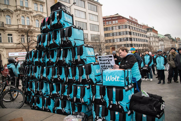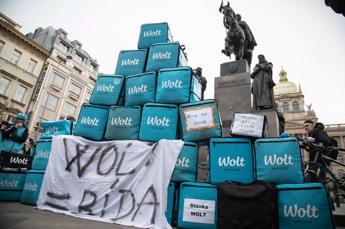 Забастовка курьеров службы доставки WOLT на Вацлавской площади в Праге