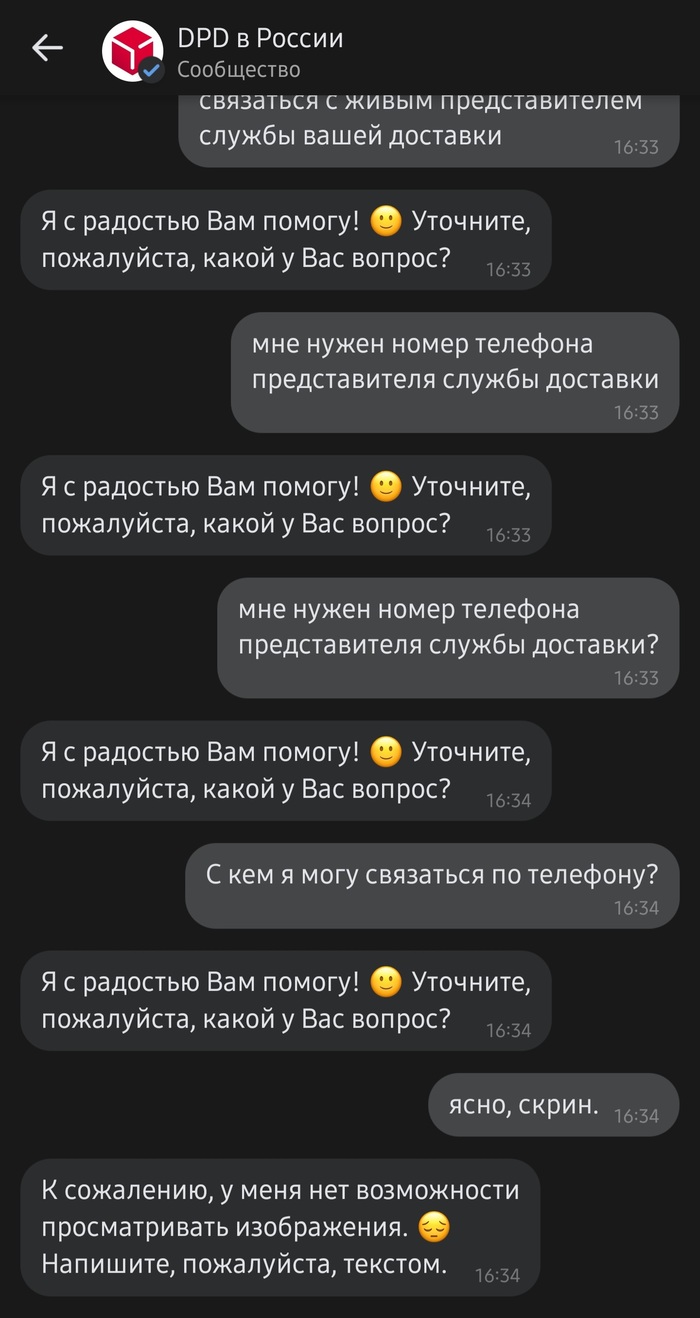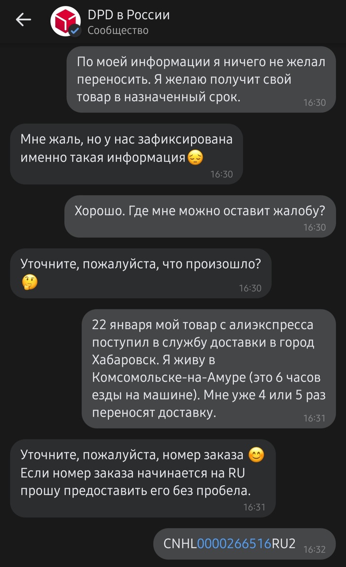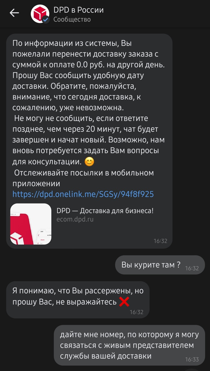 Сегодня доставку перенесли в 4 или 5 раз. Уже горит. Начал искать способы связаться с живым представителем любимой службы доставки. Нашёл только страницу вк, где отвечает тот же бот, который сообщил мне, что я сам как незаконопослушный гражданин каждый раз по своему желанию переношу дату доставки.(Скрины прилагаю).