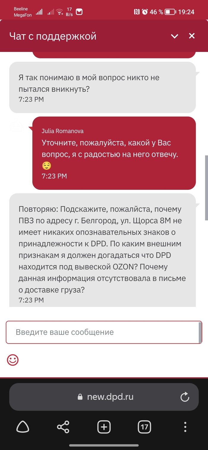 Заказал я через интернет-магазин кое-какую мебельную фурнитуру. Оплатил. Выбрал пункт доставки поблизости от офиса. Через пару (это нормально, покупал в выходные) дней пришла СМС и том, что посылочка долгожданная отправлена службой DPD. Жди, надейся, верь. Вчера пришла СМС о том, что груз доставлен и ждет меня в пункте выдачи DPD по адресу: г. Белгород, ул. Щорса, д. 8М. В конце дня весь в предвкушении подхожу к указанному адресу. Жилой дом, "свечка", с офисами на первом этаже. Обхожу по кругу - нет пункта выдачи. На всякий случай обхожу соседний корпус - тишина, в смысле не шиша...