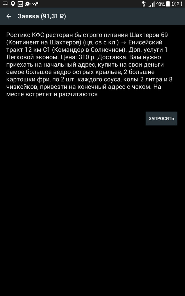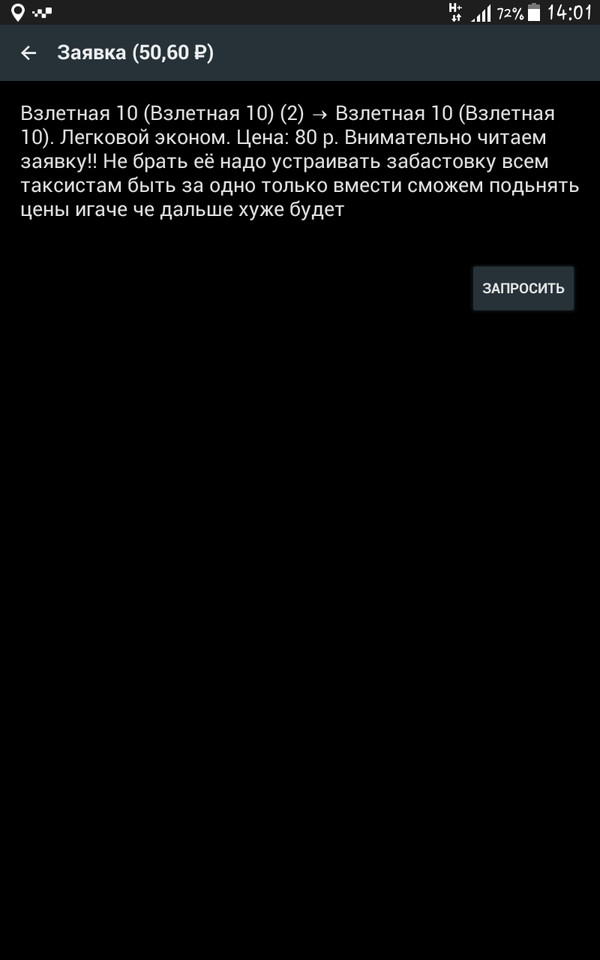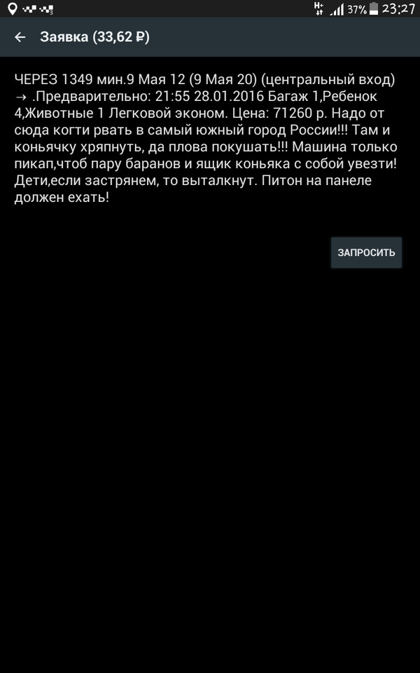 Вечерний час пик. Упала заявка по району (в час пик только такие и катаю, чтоб в пробках не стоять). Пробрался по дворам не без труда. Только подъехал - отмена. Ну и ладно... Не проходит и минуты, падает заявка из этого же дома и тоже по району. Тут же ставлю "прибыл". Жду. Выходит мужик. Садится и сообщает, что едем мы по той заявке, которую он отменил. А отменил он ее, чтоб с меня проценты не брали за заявку. Говорю, что схема ништяк, но с меня и так проценты не берут ибо я на безлимите, и что у меня другой заказ теперь. Люди уже выходят. Он давай бузить, вези, мол, о*уевший что ли, не знаю ни*уя. Нет, говорю, выходи из моего Кадиллака Робин Гуд х*ев. Он орать давай. Вобщем малеха повозиться с ним пришлось, а так норм. Только выпроводил его, сели 2 мужика, пока ехали, ржали над историей)))