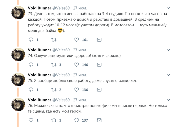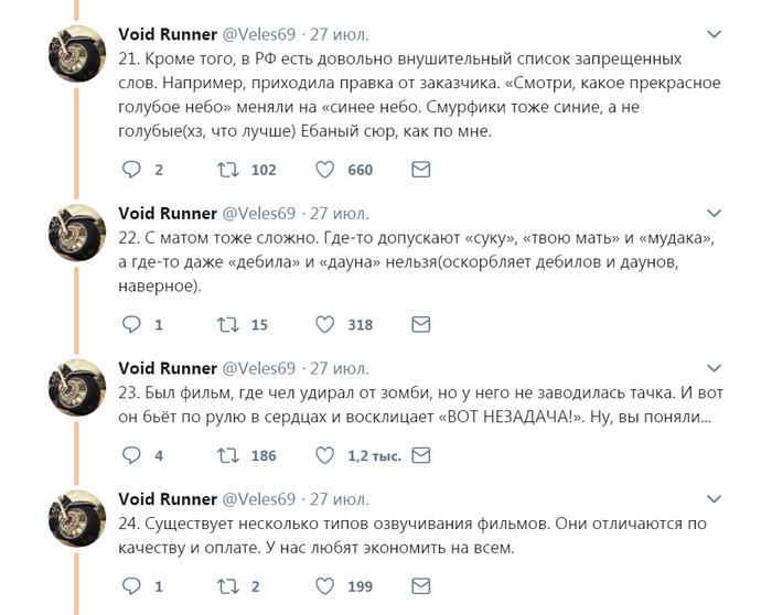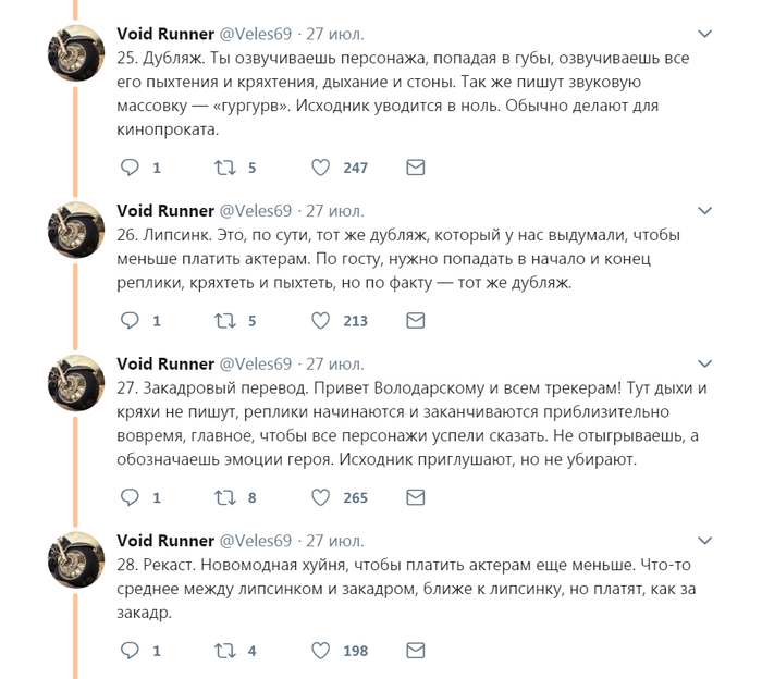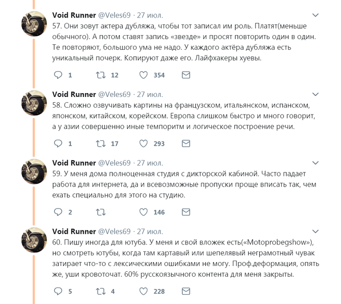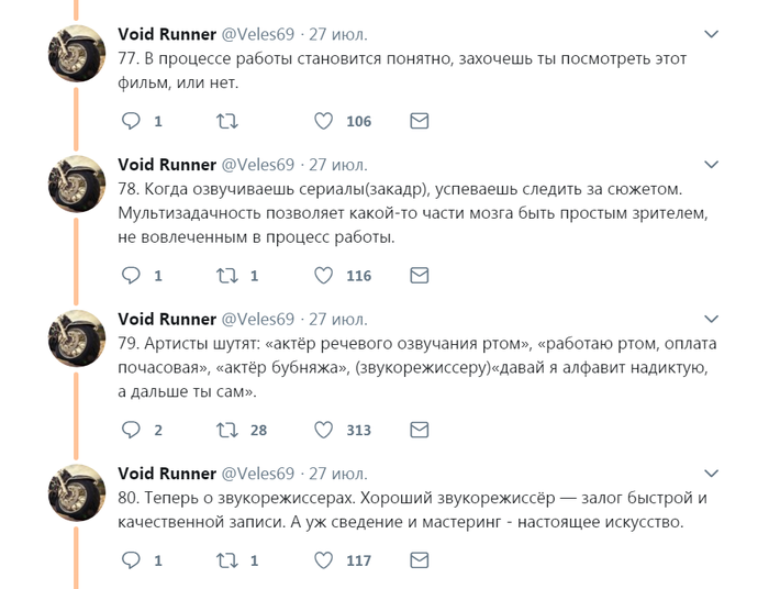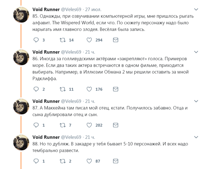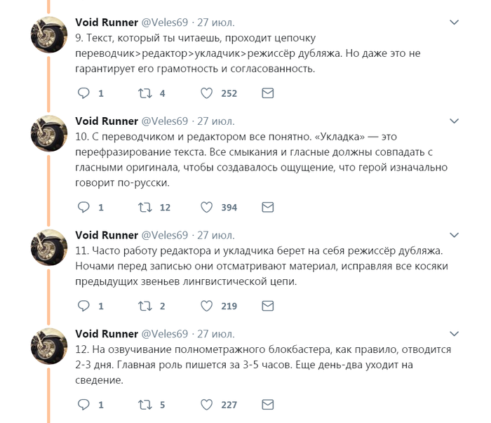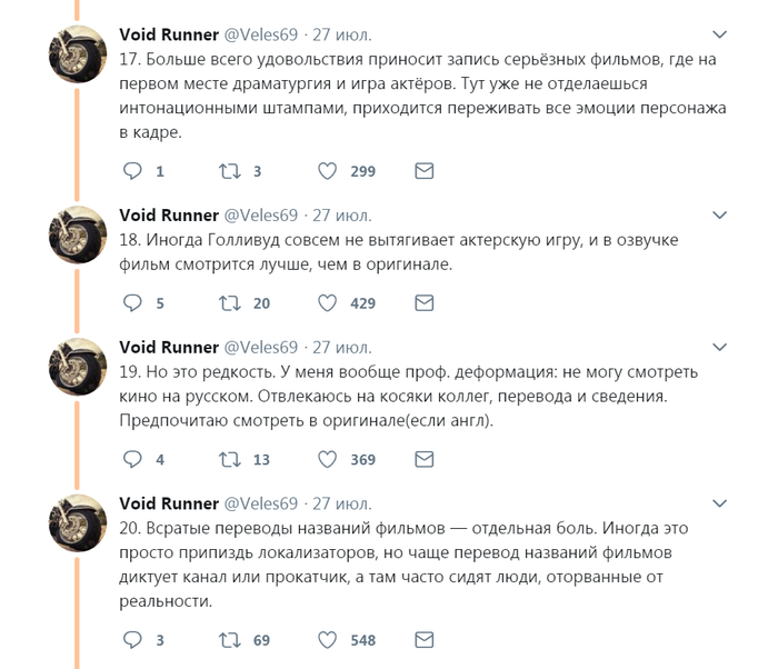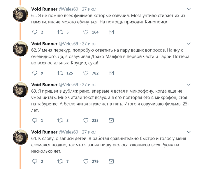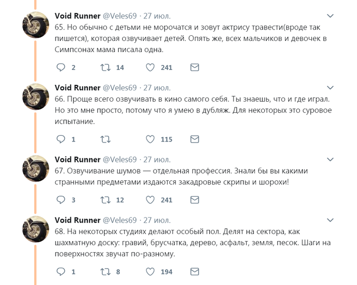 27 июля Быстров запустил в твиттере тред «1 лайк = 1 интересный факт об озвучивании фильмов».