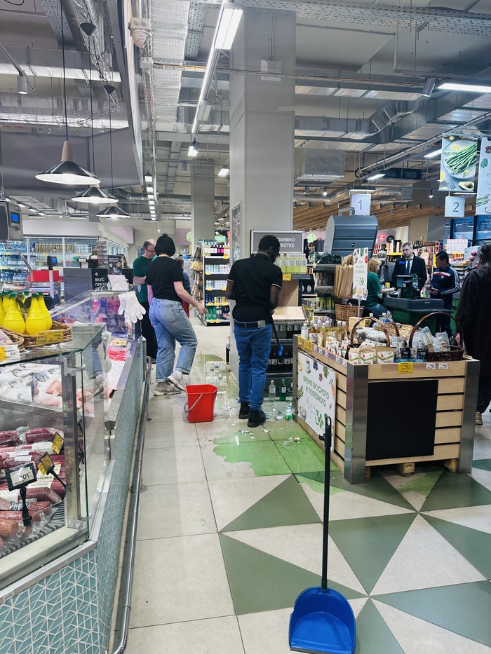 Сотрудник из ближней Азии задел вилочной тележкой стенд и вызвал каскад падающих бутылок с зеленой жижей. Или лимонадом.