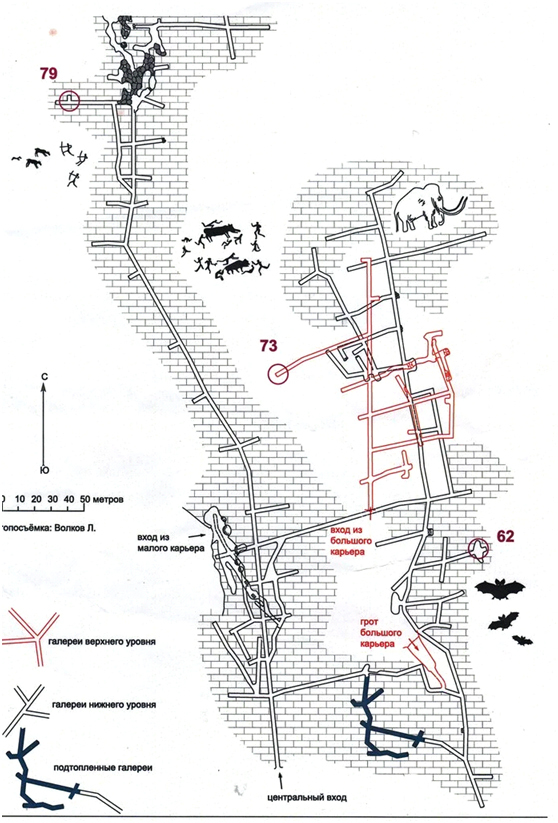 Общая протяженность ходов составляет более 4 км. Существовало 4 уровня рудника, некоторые из них уже недоступны, однако кое-где встречаются соединяющие уровни шахты.