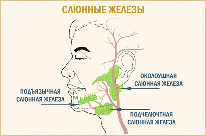 Для того, чтобы пища лучше прожевывалась, глоталась и усваивалась, а также чтобы зубы лучше очищались, а вкус был более выражен наш организм придумал ротовую полость увлажнять с помощью слюны. Соответственно, эту жидкость должен кто-то вырабатывать. И для этого мать-природа предусмотрела специальные железы, которые бывают большие и малые. Малых у нас over до хрена, их не видно глазом, она располагаются в толще слизистой по всему рту. Основной же объем слюны мы получаем из трех пар слюнных желез, которые являются отдельными органами, со своими капсулами, сосудами, клетками и протоками. Их можно узреть на этой картинке.