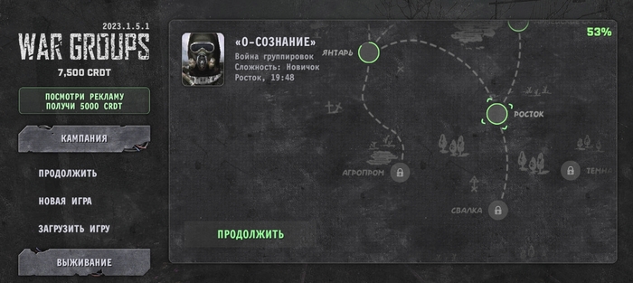 Нажав на кнопку Компания, мы видим три кнопки: продолжить, новая игра и загрузить игру. А справа, видим карту всей ЧЗО и группировку, за которую играем, сколько захватили территорий и тропы, по которым мы можем попасть на другие территории.